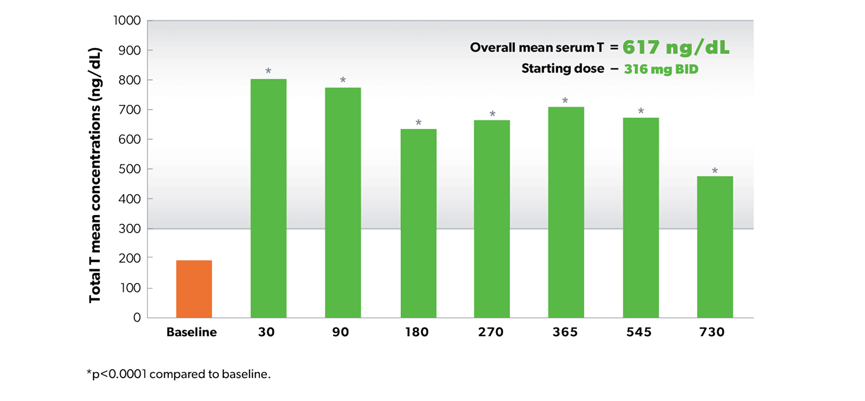 Total serum testosterone response over duration of studyAt all evaluations, serum T concentrations were in the eugonadal range (300 – 1000 ng/dL)1
